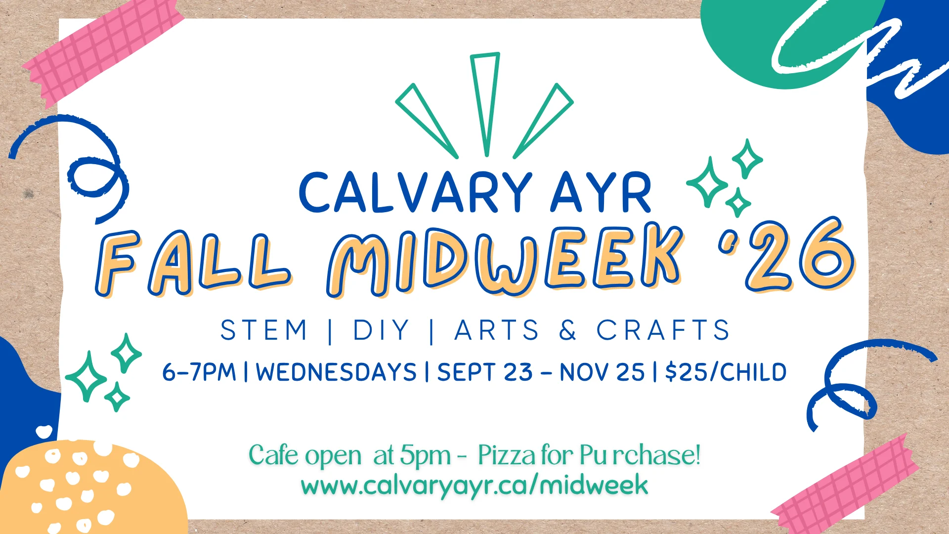 Arrive early and enjoy CAyr Café — open from 5–6 PM with pizza and drinks available for purchase. Whether your child loves crafts, worship music, STEM projects or just making new friends, Midweek is the best hour of their week.
